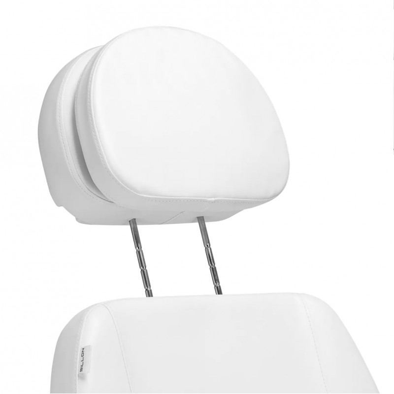 De ergonomisch gevormde fauteuil zorgt voor een comfortabele lichaamshouding tijdens de behandelingen en de brede zitting garandeert optimaal comfort. De mogelijkheid om de fauteuil tot een ligpositie te verstellen en een verborgen opening in de hoofdsteun onder het kussen maken hem ideaal voor gezichts- en rugbehandelingen, evenals massages . Verstelbare armleuningen, die 180 graden draaibaar zijn , zorgen voor comfortabel zitten en een goede toegang voor de cliënt. Ze kunnen indien nodig snel en eenvoudig worden verwijderdLuxe elektrische schoonheidsstoel 3 motoren wit voetbediening