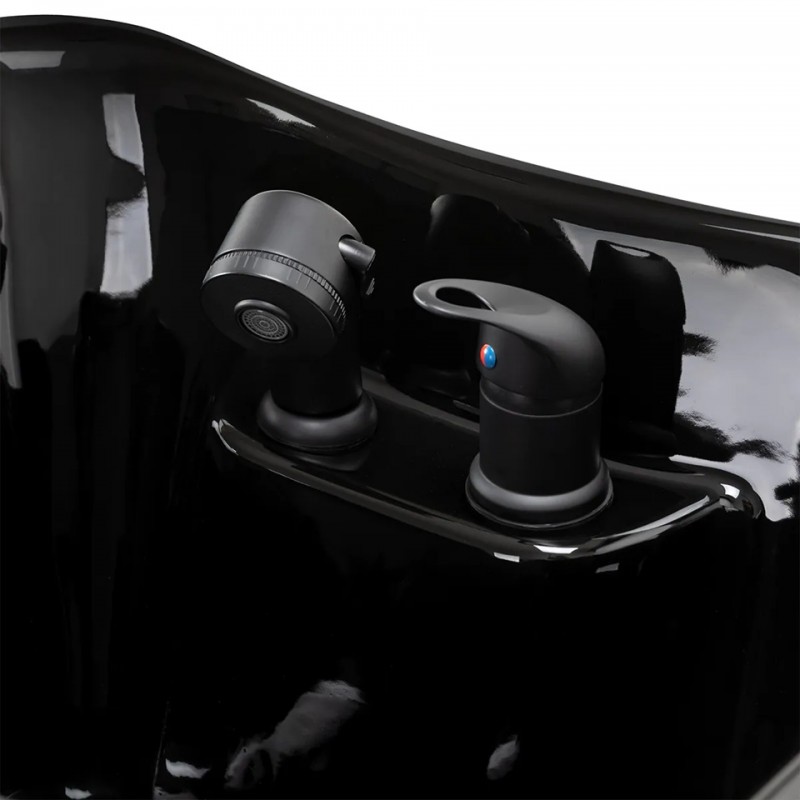 De wasstraat is uitgerust met een mengkraan die gemakkelijk toegang biedt tot warm en koud water, waardoor de temperatuur nauwkeurig kan worden aangepast aan de individuele voorkeuren van de klant . Een praktische ophangplek voor de handset vergemakkelijkt het werk, terwijl een aftapplug met een speciaal zeefje u de waterstroom laat regelen en hoge hygiënenormen in de salon handhaaft. De wateraansluiting bevindt zich in de voet , waardoor de installatie discreet verborgen blijft en bijdraagt ​​aan de esthetiek en netheid van de werkplek. Het ergonomische ontwerp van de wasstraat garandeert comfort tijdens verschillende behandelingen , en de doordachte combinatie van functionaliteit en detail maakt het dagelijkse werk in de salon nog comfortabeler .