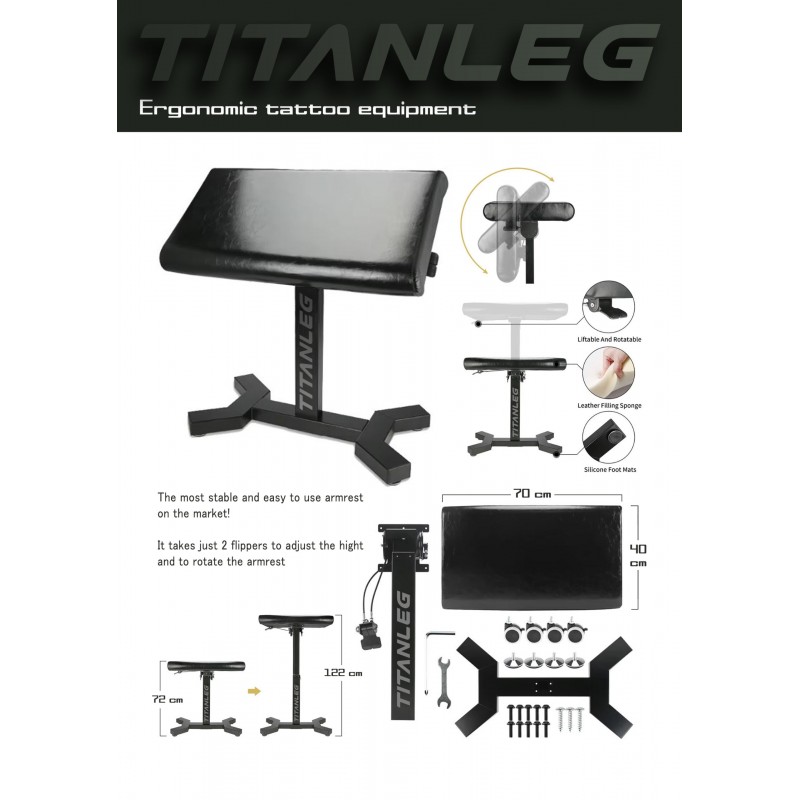 Armsteun van Titan Equipment verbetert de tatoeëer ervaring door stabiliteit, ergonomische ondersteuning en moeiteloze verstelbaarheid te bieden. Het extra grote beklede oppervlak verhoogt het comfort van de klant en helpt tatoeëerders een correcte lichaamshouding aan te nemen door de belasting op rug en armen tijdens lange sessies te verminderen.