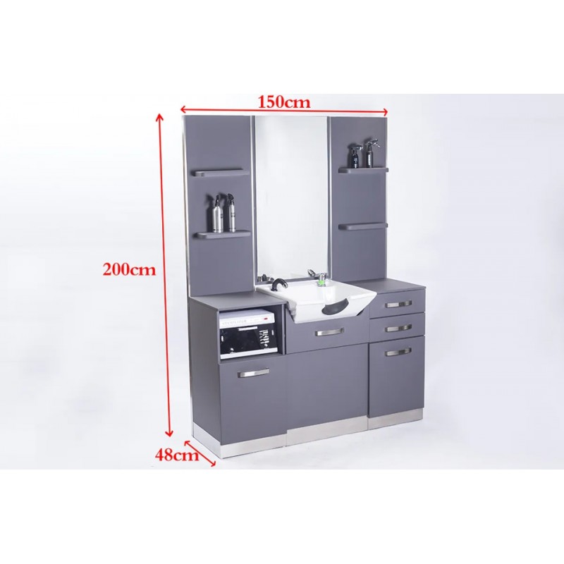 Een moderne zwarte kaptafel met zilveren afwerking.
